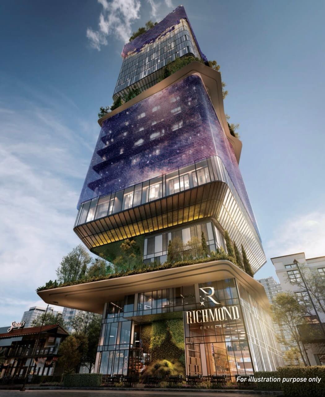 リッチモンド・エステラールは、Richmond Asia Groupが開発する永久所有権付き商業地契のホテル型サービススイートです。KLの中心地、ブキッ・ビンタンに位置し、地上18階建ての1棟構成で、全199戸のユニットが用意されています。建築設計はAxial Design Architectが担当し、スペインとマレーシアの文化を融合したファサードが特徴です。